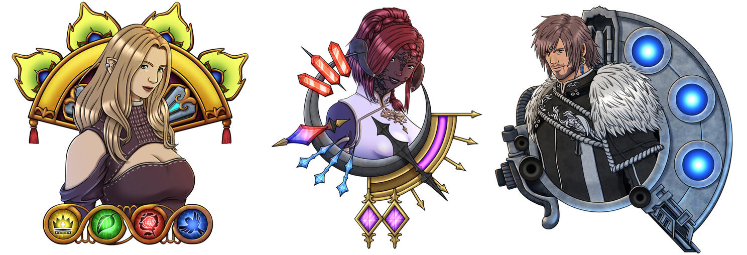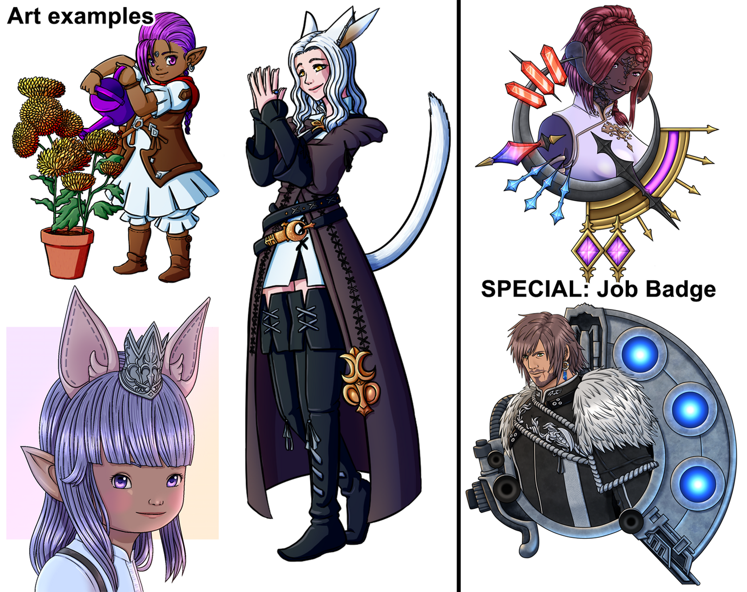 A fully colored bust of a character (OC or NPC) with the Final Fantasy 14 job UI of their choice.